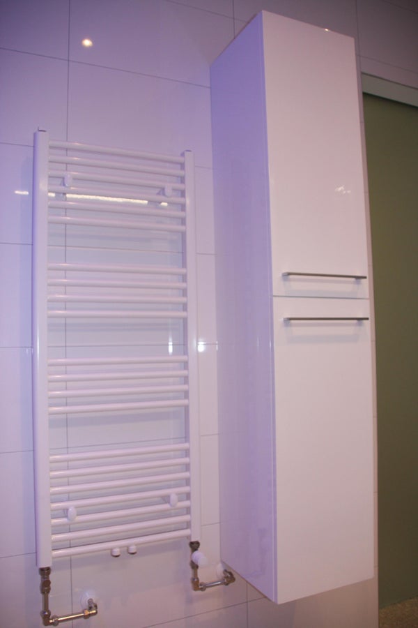 Badkamer: ligbad, douche, 2 wastafels, spiegelkast en aansluiting wasmachine en droger