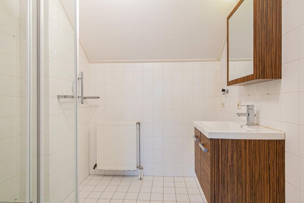 De badkamer is praktisch ingedeeld en beschikt over een ligbad voor de ontspannende momenten, een aparte douchehoek voor het snelle dagelijkse gebruik, een vaste wastafel en een neutrale tegelafwerking, waardoor u hier eenvoudig uw eigen woonstijl kunt doorvoeren.