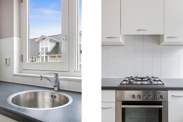 De open keuken in L-opstelling sluit prettig aan op de woonkamer en biedt alle ruimte om uitgebreid te koken, terwijl u toch in contact blijft met gezelschap aan de eettafel. De keuken is uitgerust met diverse inbouwapparatuur, wat bijdraagt aan optimaal kookgemak.