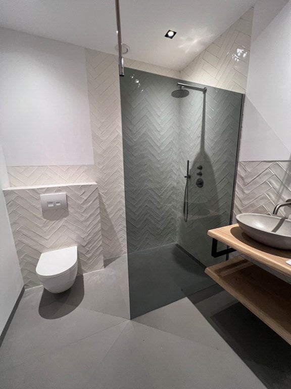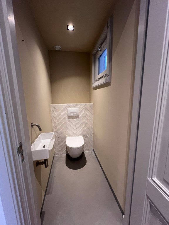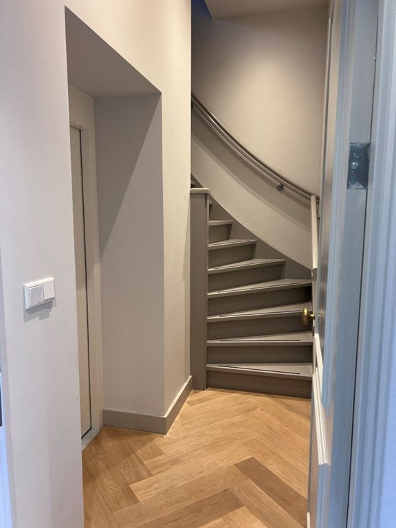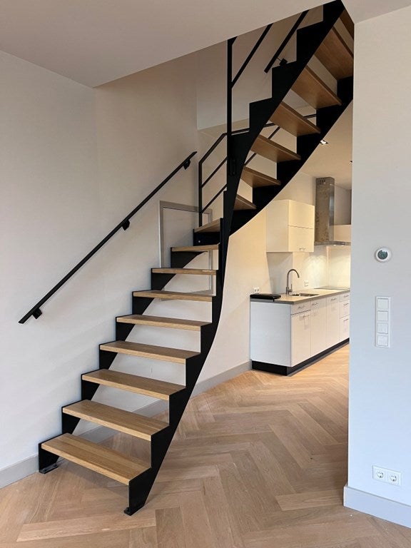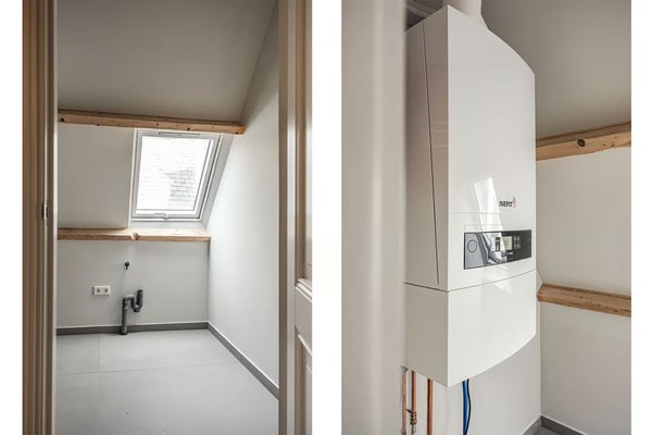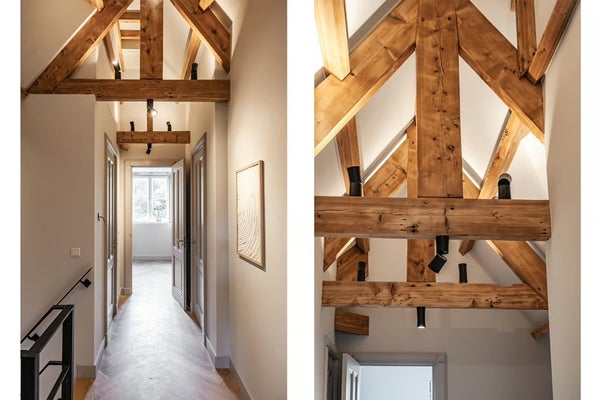 Een moderne trap leidt naar de tweede verdieping met een ruime overloop waar de balkenstructuur zichtbaar is. Hier vindt u een zeer ruime master bedroom met een luxe en-suite badkamer met een ligbad, dubbele wastafel, toilet en inloopdouche. De originele houten balken voegen warmte en karakter toe, terwijl de hoge plafonds en eiken visgraatvloeren met vloerverwarming een verfijnde sfeer creëren.