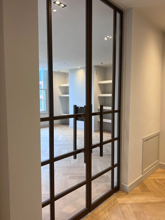 Ruime hal met een royale gastentoilet. Elegante stalen draaideuren openen naar de indrukwekkende woonkamer met grote ramen die een vrij uitzicht bieden op het park en het historische vijver. De woonkamer heeft een prachtige op maat gemaakte wandmeubel met een ingebouwde gashaard. De volledig uitgeruste keuken bevindt zich aan de achterkant dicht bij een gezellige eetkamer, die toegang biedt tot een klassiek balkon via openslaande deuren met uitzicht op de ingang en het bos tegenover.