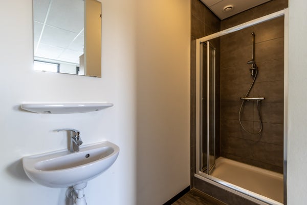 Vanuit de leefruimte heb je toegang tot het toilet en de slaapkamer. De badkamer met wastafel en douche met thermostatische mengkraan kun je bereiken via de slaapkamer.