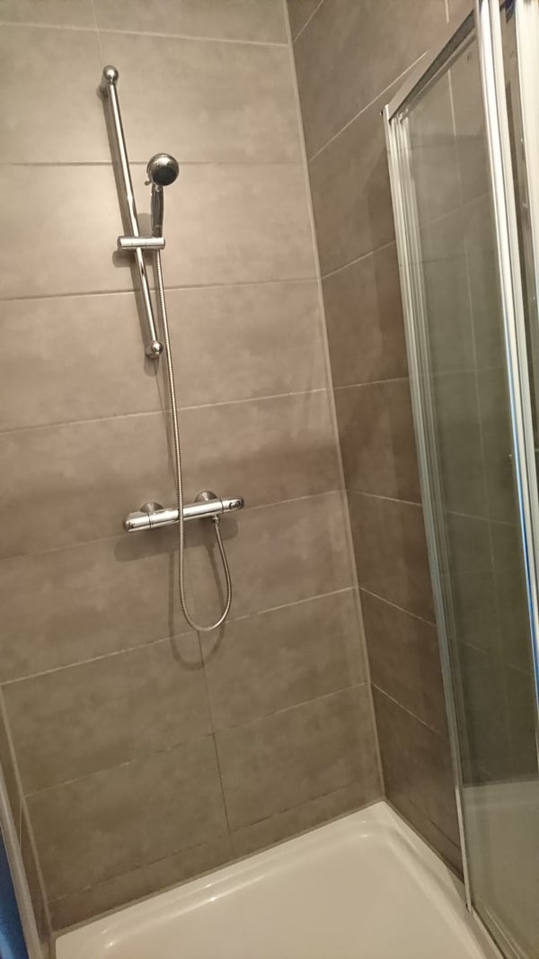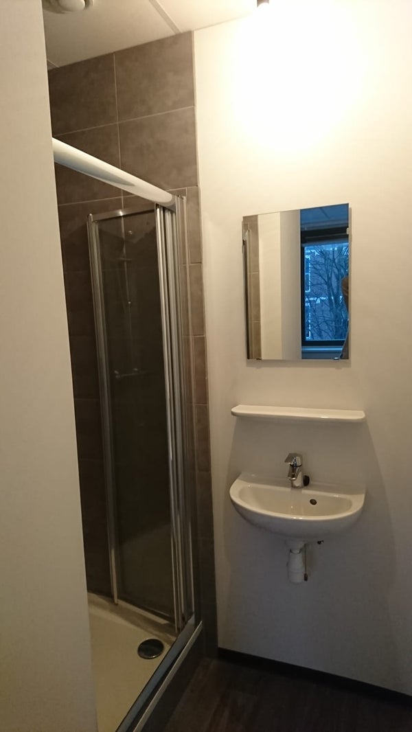 Vanuit de leefruimte heb je toegang tot de badkamer met wastafel en douche met thermostatische mengkraan. Het toilet bevindt zich vlak naast de entree van de studio.
