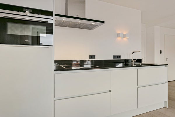 Overdekte portiek, entree van appartement, ruime hal, logeerkamer cq. Hobbykamer (7m2), luxe badkamer met slechte voorzieningen van een douche en luxe apart toilet met hangkast. In de eerste slaapkamer is er plek gemaakt voor de wasmachine. De grote hoofdslaapkamer heeft voldoende ruimte om een kastenwand en 2-persoonsbed neer te zetten. De ruime woonkamer met een prachtige vloer en als richtpunt het kookgedeelte voorzien van granieten aanrechtblad, inductiekookplaat, afzuigkap, vaatwasser, koelkast, oven, veel pannenlades en algemene kastruimte. De kamer beschikt over een Frans balkon met openslaande deuren.