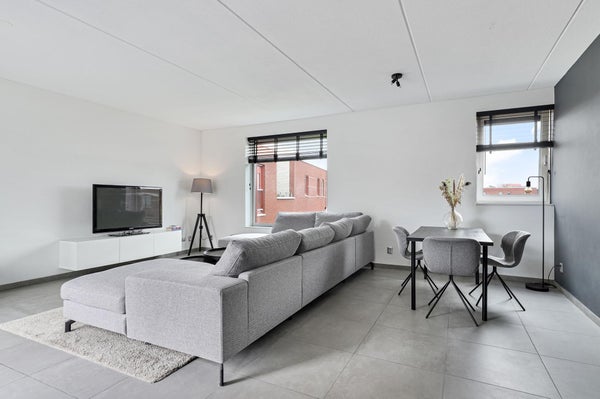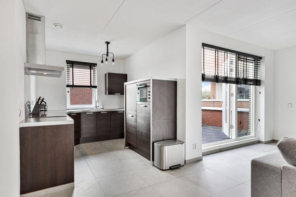 De ruime, lichte woonkamer valt direct op door de royale lichtinval en de stijlvolle inrichting. Via de openslaande deuren bereikt u het ruime dakterras op het noordwesten, waar u lang kunt genieten van de zon.