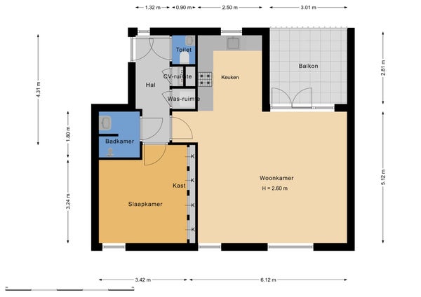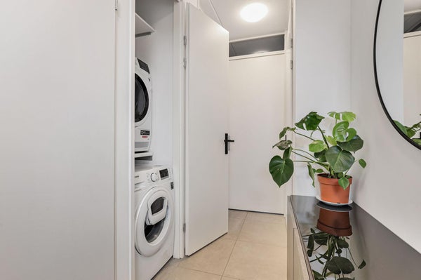 De wasmachine- en drogeraansluiting bevinden zich in de bergkast.