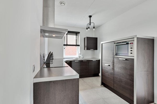 De open keuken is modern en volledig uitgerust met onder andere een inductiekookplaat, afzuigkap, combimagnetron, koelkast, vaatwasser, spoelbak en veel kastruimte.
