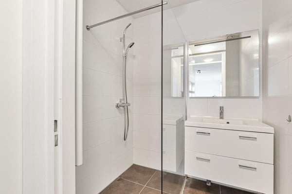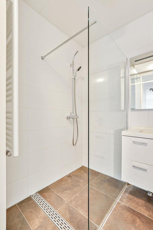 De badkamer heeft een tijdloze afwerking met inloopdouche, wastafel met meubel en betegeling tot aan het plafond.