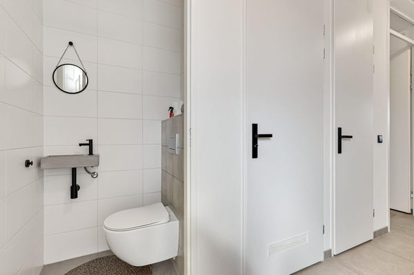 Entree met hal, meterkast, bergkast, separaat toilet met fonteintje en toegang tot de badkamer, slaapkamer en woonkamer.