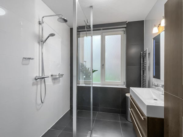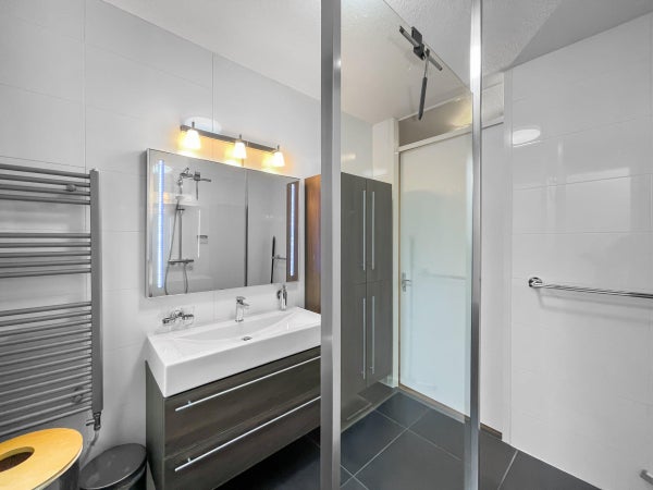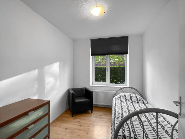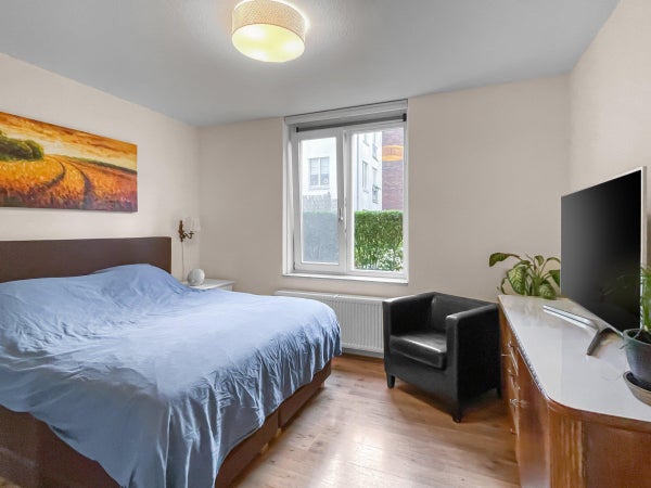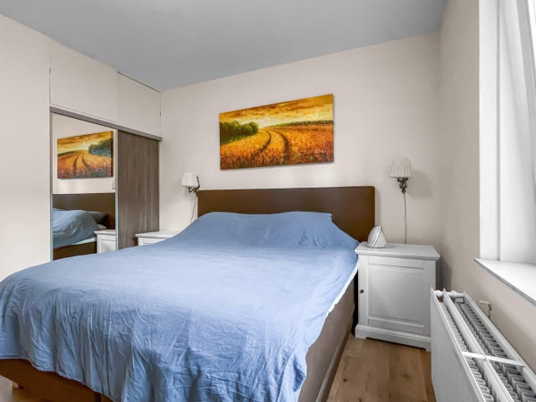 De woning beschikt over twee comfortabele slaapkamers van verschillend formaat. Vanuit de hal bereikt u tevens de inpandige berging met wasmachine- en drogeraansluiting. De moderne badkamer is stijlvol afgewerkt en voorzien van een wastafel met spiegel en een ruime inloopdouche.