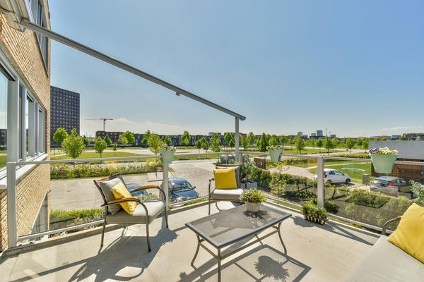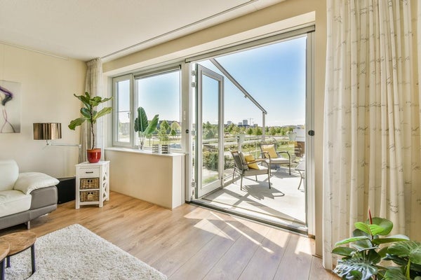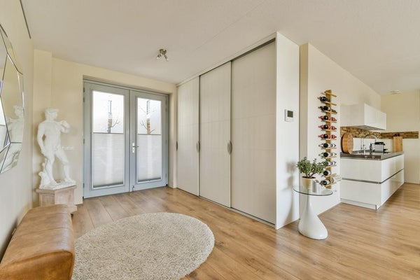 Je komt de woning binnen bij de woon-/eetkamer. Achter de garderobe deuren aan de linkerkant vind je de meterkasten en veel bergruimte. In het gehele appartement ligt een laminaatvloer en vloerverwarming. De woonkamer is licht en ruimtelijk. Via openslaande deuren vanaf de woonkamer bereik je het ruime balkon. Je zit hier vanaf vlak voor het middaguur tot aan het eind van de dag in de zon.
