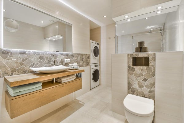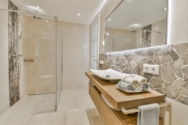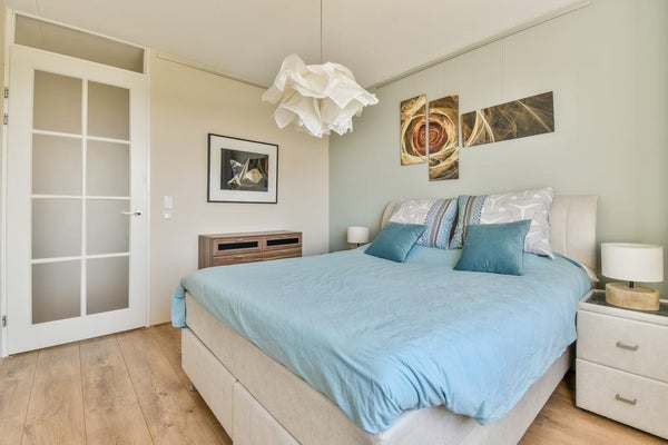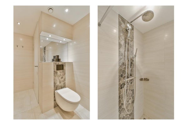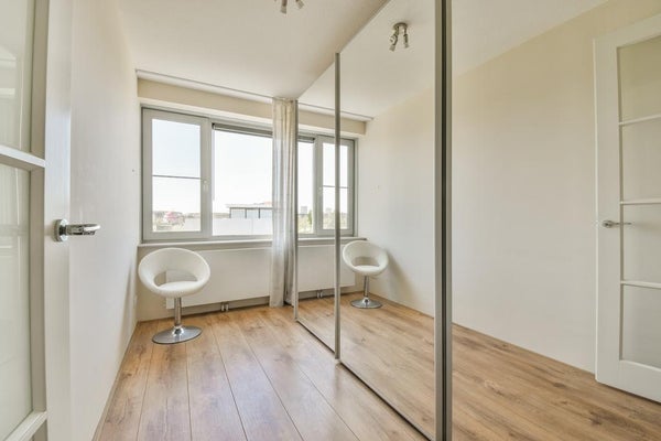 Het appartement heeft twee slaapkamers. In de kleine slaapkamer staat een grote spiegelkast en dus is deze kamer geschikt als inloopkast en/of werkkamer. De badkamer is voorzien van een inloopdouche, toilet en badkamermeubel met verlichting en verwarming. Achterin vind je een nis voor de wasmachine en droger. Er is ook een bergkast met mechanische ventilatie.