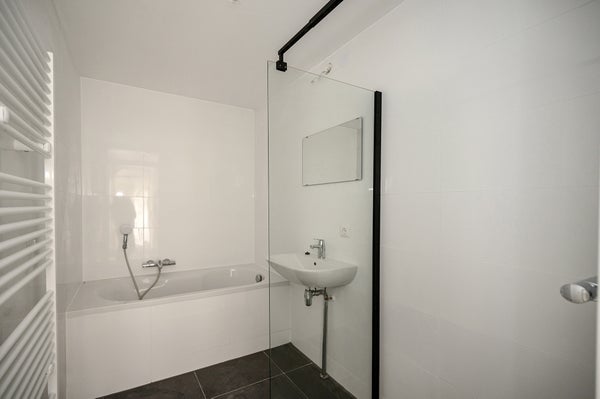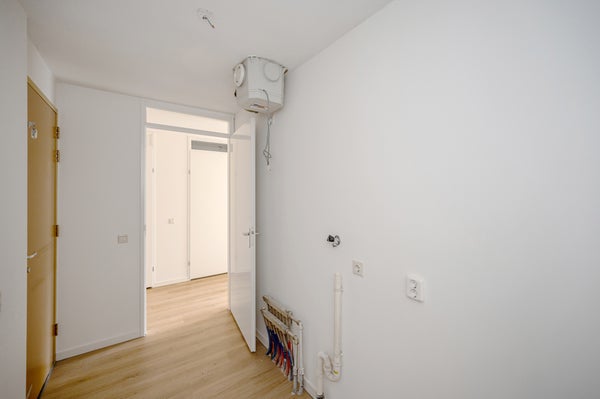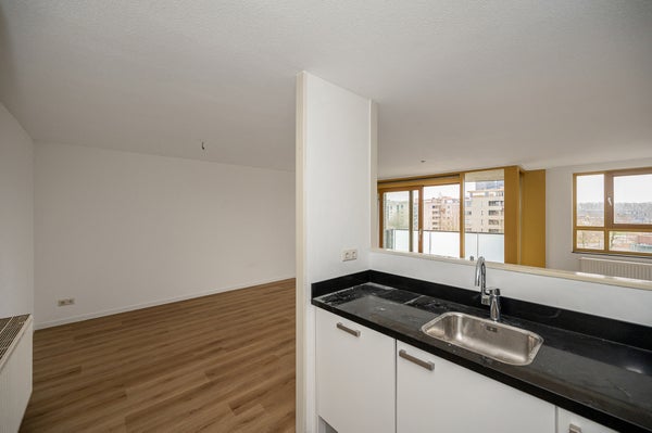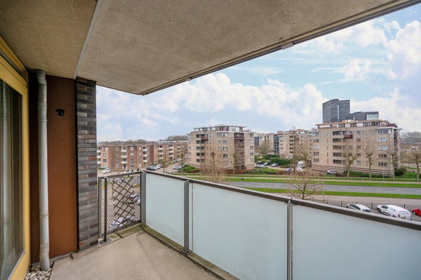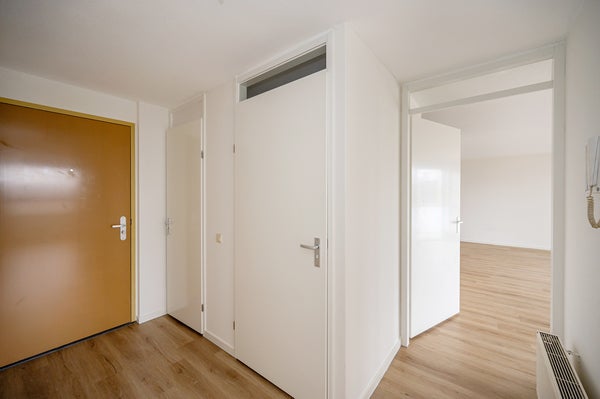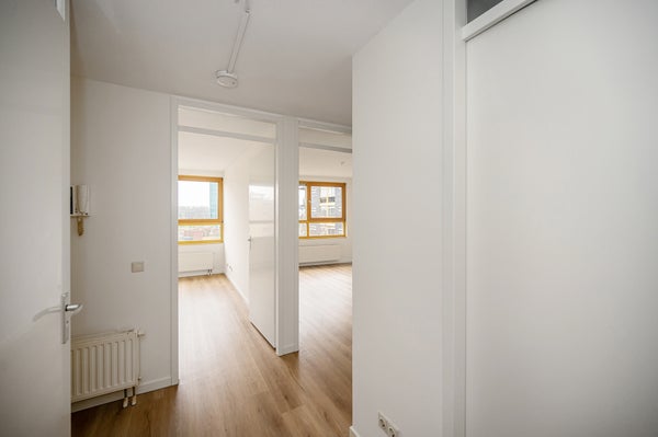 Binnenkomst in de hal met toegang tot een inpandige berging met mechanische ventilatie en een separaat toilet met fonteintje. Vanuit de hal bereikt u de twee ruime slaapkamers, variërend in grootte. De lichte woonkamer, met grote raampartijen, biedt toegang tot het ruime balkon met uitzicht op de stad. De keuken is uitgerust met een vaatwasser, oven en een kookplaat. De woning is voorzien van een laminaatvloer. De badkamer is volledig betegeld en voorzien van een ligbad, aparte douche, een wastafel en een spiegel.