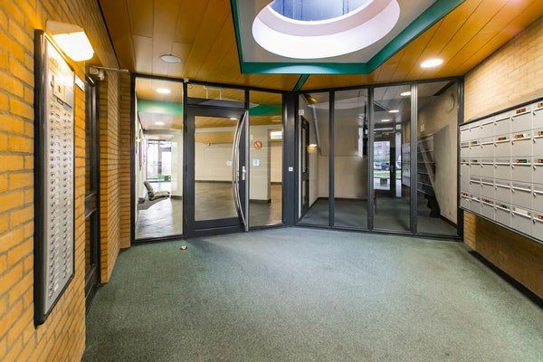 Centrale hal met bellentableau, postkasten, liften, trapopgang, toegang tot de bergingen en de afgesloten parkeergarage.
