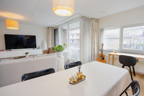Omschrijving: Deze woning heeft een ideale indeling met een ruime woonkamer, een open keuken en 2 slaapkamers. De woning is goed onderhouden en biedt veel lichtinval door de grote ramen. De keuken is voorzien van diverse inbouwapparatuur, zoals een kookplaat, oven, vaatwasser en koelkast. De badkamer beschikt over een inloopdouche, wastafel en het toilet is separaat gelegen.