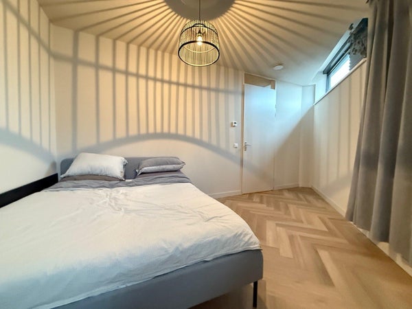 Ruime ouderslaapkamer met kast en tweepersoons bed. Tweede slaapkamer aan de achterzijde gelegen, deze heeft een wat speelse indeling door de hoekligging. In de tweede kamer staat ook een kast en in overleg een tweepersoonsbed. Via de hal toegang tot de nette badkamer welke voorzien is van een ruime inloopdouche en een wastafelmeubel. Separaat toilet. Ruime inpandige berging met de warmtepomp en aansluiting voor de wasmachine en droger, in deze kast is nog ruimte voor bijvoorbeeld het hangen van jassen/schoenen en een opbergruimte.
