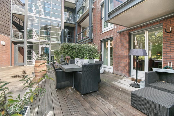 Op de begane grond van dit kleinschalige appartementencomplex ligt het zeer goed onderhouden appartement met privé zonneterras. De woning beschikt over een luxe keuken, badkamer, 2 slaapkamers en een ruime lichte woonkamer met open keuken. De tweede slaapkamer is thans ingericht met een inloopkast maar deze zou weggehaald kunnen worden zodat de slaapkamer als kinderkamer of werk kamer ingericht kan worden. Het privéterras grenst aan de gemeenschappelijke binnentuin en u heeft vrij uitzicht op het zuiden!