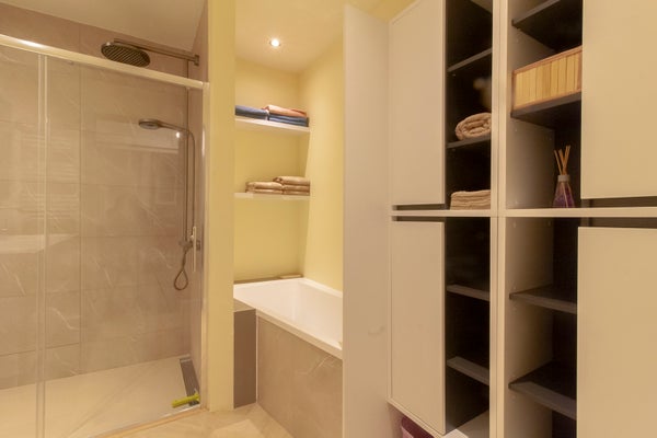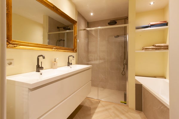 De badkamer beschikt over een dubbel wastafelmeubel, extra kastruimte, een regendouche en een bad met douche. In het appartement bevindt zich tevens een separaat toilet met fonteintje.