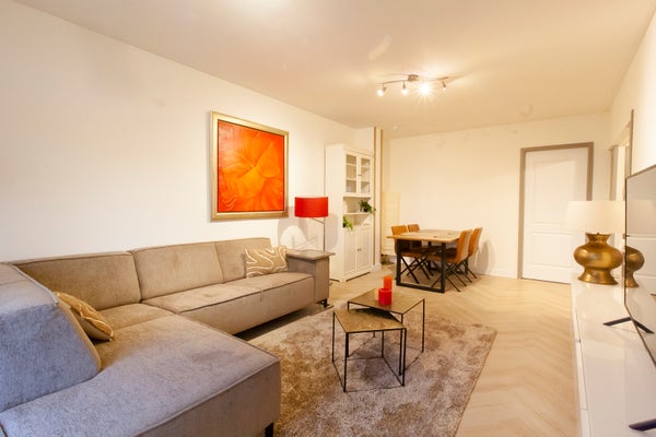 De ruime woonkamer is volledig ingericht met nieuw, luxe meubilair en is gelegen op het westen. Dankzij de gunstige ligging en de situering op de vijfde etage komt er veel natuurlijk licht binnen.