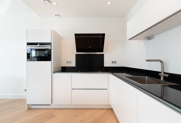 Via de centrale entree bereikt u met trap of lift de 4e verdieping. De entree van het appartement geeft toegang tot alle vertrekken. De lichte woon-/eetkamer beschikt over een moderne open keuken met diverse inbouwapparatuur, waaronder een vaatwasser, combi-oven, elektrische kookplaat, koelkast met vrieslade en afzuigkap.
