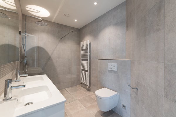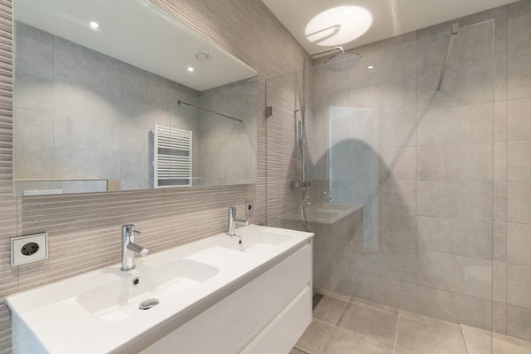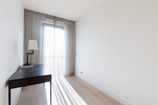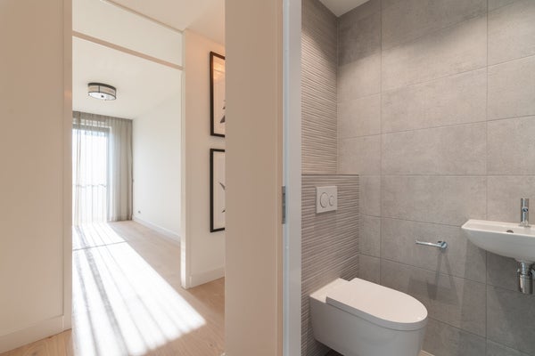 In de hal bevinden zich het toilet en een aparte was-/bergruimte met wasmachine en droger. De luxe badkamer is uitgevoerd in een neutrale kleurstelling en voorzien van een ligbad, separate douche, toilet en dubbele wastafel. Het appartement beschikt over twee goed bemeten slaapkamers.