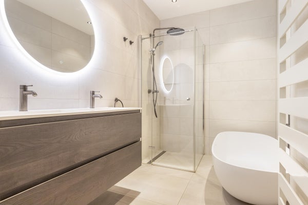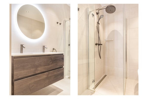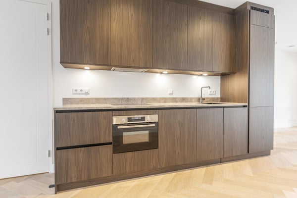De open keuken is voorzien van hoogwaardige inbouwapparatuur, waaronder een inductiekookplaat, combimagnetron, vaatwasser en koel-vriescombinatie. De badkamer is uitgerust met een vrijstaand ligbad, een aparte douche en een dubbele wastafel, wat bijdraagt aan het luxe gevoel van het appartement.