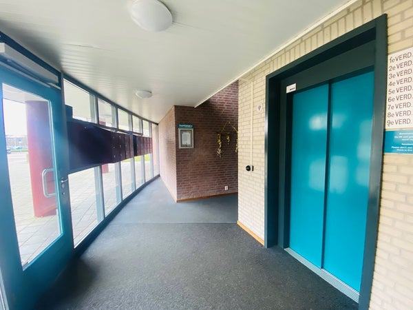 Indeling 5e verdieping (met lift, in het verzorgde gebouw): entree, hal met inbouwkasten.