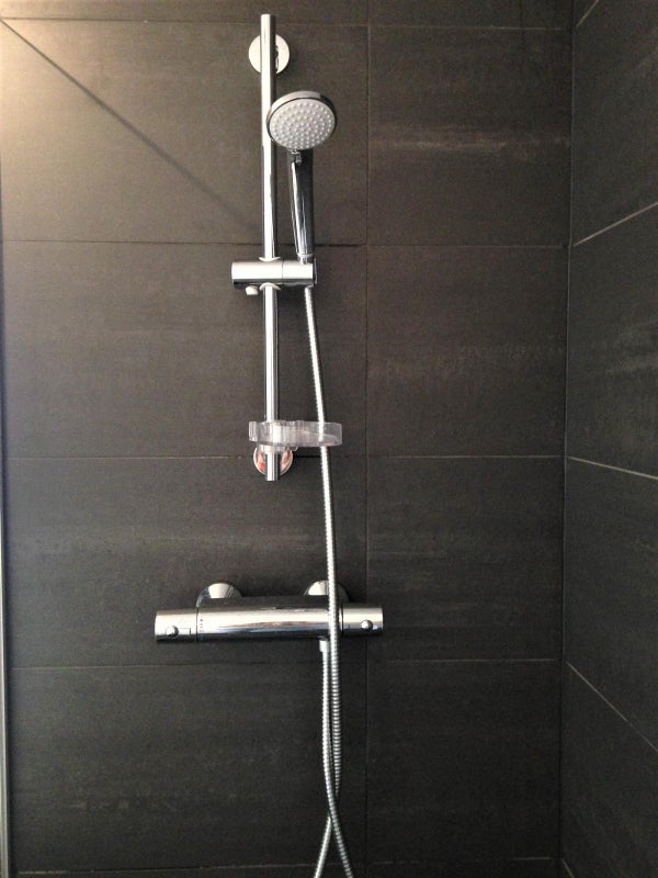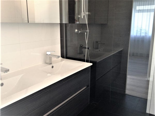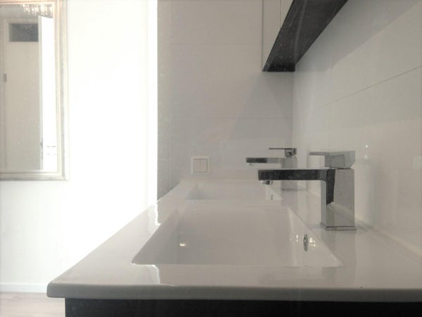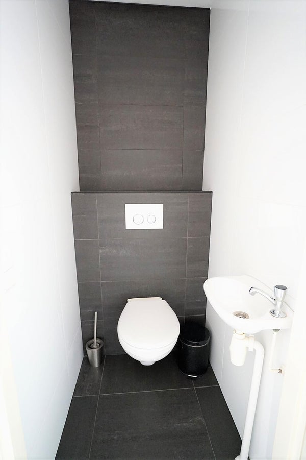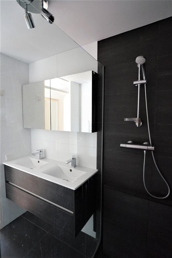 De gang geeft aan de linkerkant toegang tot de moderne badkamer met inloopdouche, dubbele wastafel, badkamermeubel en er is een separaat (zweef)toilet. Aan de voorkant heeft het appartement een zonnige voortuin en een ruime externe berging.