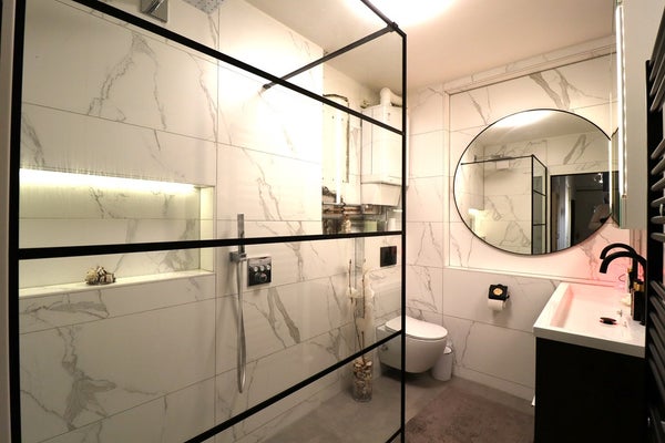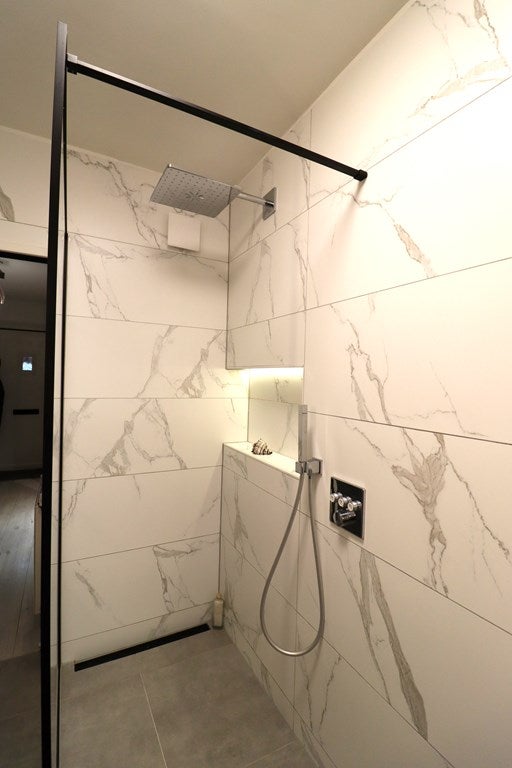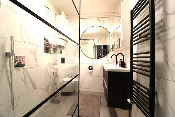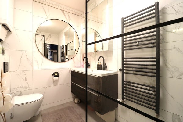 • Badkamer met douche, dubbele wastafel en toilet