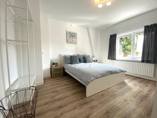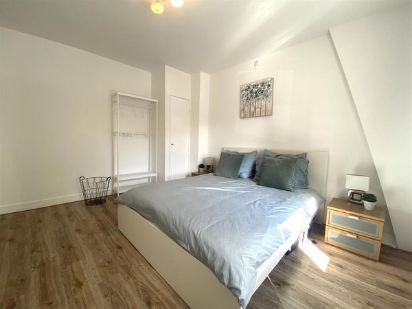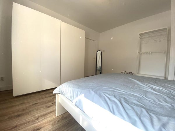 De grote slaapkamer is heerlijk ruim en ook licht. Er staat een groot tweepersoonsbed, een grote kledingkast met schuifdeuren en een ingebouwde kast.