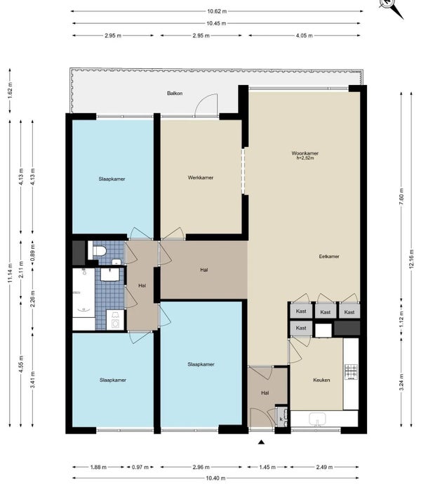 Het appartement beschikt over een heldere open woon- en eetruimte met grote ramen die zorgen voor overvloedig natuurlijk licht. De aparte keuken is volledig uitgerust met moderne apparatuur. Er zijn in totaal vier slaapkamers - drie gemeubileerd en één ongemeubileerd - wat flexibiliteit biedt voor een thuiskantoor of persoonlijk gebruik. Laminaatvloeren lopen door het hele appartement, wat een schone en moderne afwerking geeft.