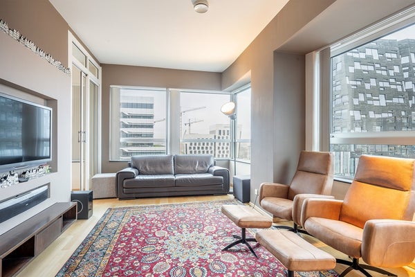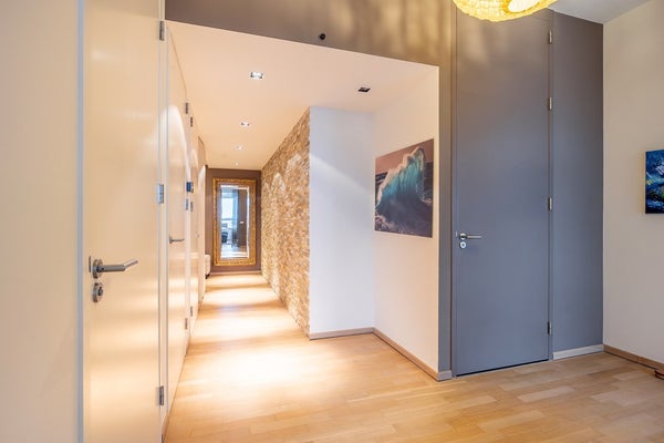 Dit hoekappartement heeft een ruime woonkamer met open keuken. Het panoramische uitzicht over de stad is echt uniek. De grote (schuif)ramen zorgen ook voor veel licht en er ligt een parketvloer met vloerverwarming en vloerventilatie door het hele huis. Ingebouwde spotlights van het Modular merk zijn gekozen voor de verlichting. Je vindt dit door het hele huis.
