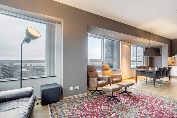 3-kamer appartement van ongeveer 114m² op de 18e verdieping. Een beroemde internationale ontwerper gespecialiseerd in interieurarchitectuur (alleen merk en op maat gemaakte meubels). Het heeft een adembenemend uitzicht over de stad in de super luxe New Amsterdam residentiële toren. Het appartement is gelegen in het moderne en een van de duurste gebieden van Amsterdam.