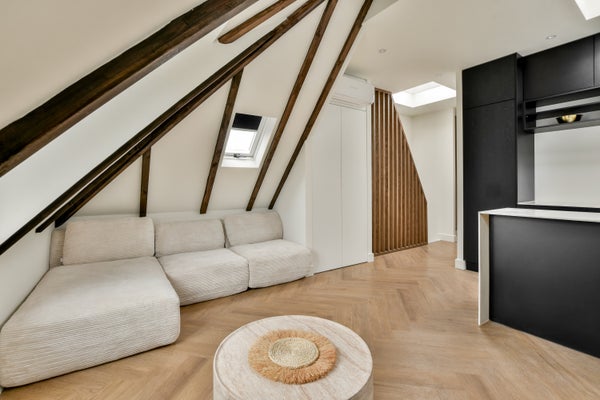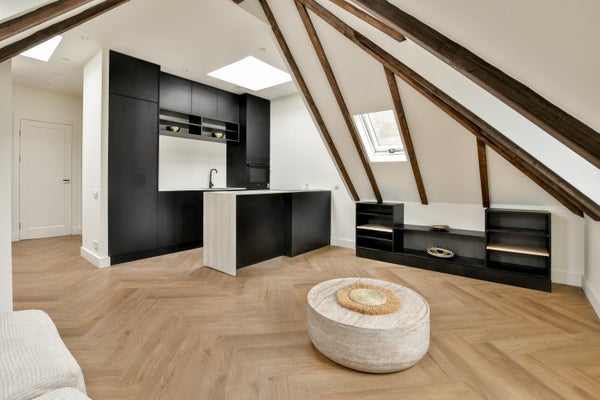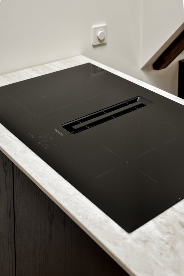 U komt het appartement binnen via een eigen entree op de vierde verdieping. De lichte woonkamer is stijlvol ingericht en voorzien van een comfortabele zithoek met bank en een op maat gemaakte tv-kast. De moderne afwerking en het gebruik van hoogwaardige materialen zorgen voor een verfijnde uitstraling. De open keuken grenst direct aan de woonkamer en is volledig uitgerust met een kookeiland met inductieplaat, Quooker, vriezer en combi-oven/magnetron.