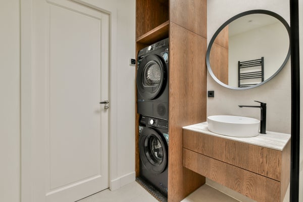 De badkamer is modern afgewerkt en voorzien van een ruime inloopdouche, handdoekradiator en luxe sanitaire voorzieningen. Daarnaast zijn er een aparte wasmachine en droger aanwezig, zodat alle gemakken binnen handbereik zijn.