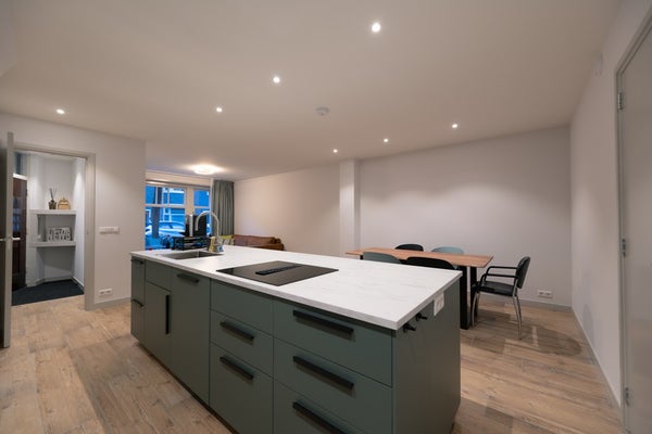 Lichte en sfeervolle woonkamer met grote raampartijen, strakke afwerking en een open verbinding met de keuken. De ruimte voelt ruim en comfortabel aan. De gehele ruimte is voorzien van vloerverwarming en een stijlvolle houtlook stenen vloer.