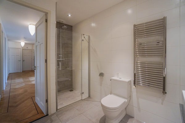 Hal, afzonderlijk toilet, ruime woonkamer aan de voorkant, volledig uitgeruste keuken, 3 slaapkamers aan de achterkant, elk met hun eigen toegang tot de tuin en een badkamer met een bad, wastafel, douche en toilet.