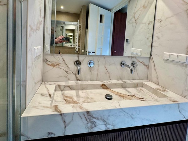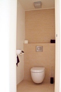 Het aparte toilet, gelegen in de entreehal, heeft elektrische vloerverwarming en dezelfde elegante Italiaanse marmeren tegels als in de badkamer.