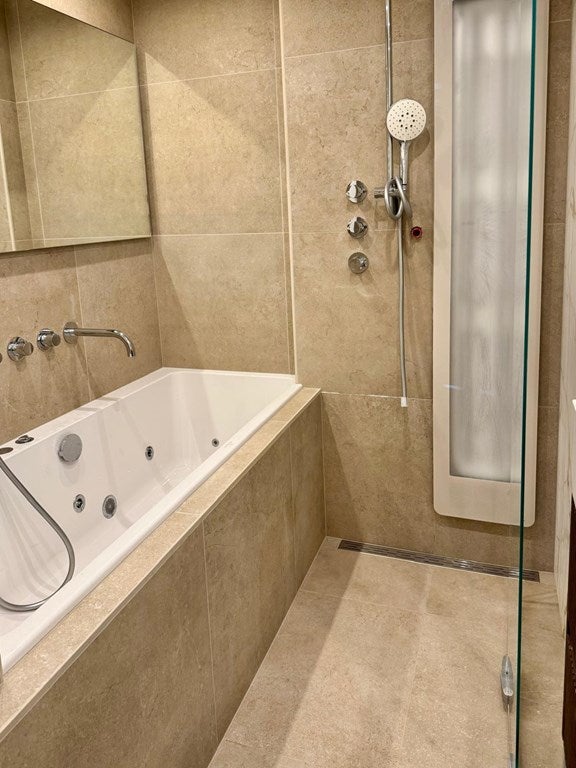 De ensuite badkamer geeft een luxe spa-gevoel met een Villeroy & Boch jacuzzi badkuip, een dubbele wastafel met twee ingebouwde mengkranen, een inloopdouche met zowel een regen- als handdouche, en als kers op de taart, een ingebouwde zonneshower die het hele lichaam verlicht met verwarmende infrarood- en een lage dosis UV-licht, wat uw mobiliteit verbetert en uw vitamine D-niveau verdubbelt.