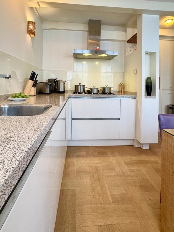 De volledig uitgeruste keuken heeft een vaatwasser, koelkast, oven en magnetron. Het grijs-zwart kwartscomposiet aanrechtblad combineert de schoonheid van natuursteen met de praktische voordelen van moderne techniek, waaronder een grote inductiekookplaat van 90 cm en een slanke geïntegreerde afzuigkap.