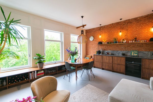 Bij binnenkomst in het appartement zul je onmiddellijk de originele bruine steenwanden langs de trap opmerken, die naadloos zijn geïntegreerd in het ontwerp van het appartement.