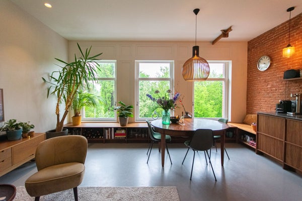 Met uitzicht op het Oosterpark, versmelt de gezellige woonkamer naadloos met een moderne, notenhouten open keuken met een Italiaans marmeren blad. De keuken is uitgerust met topklasse apparatuur, waaronder een kookwaterkraan, een ruime koelkast en vriezer, een Bora inductiekookplaat met ingebouwde afzuigkap en een Siemens vaatwasser.