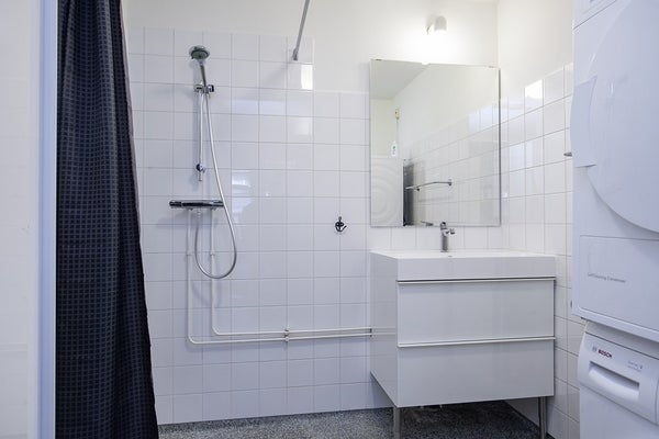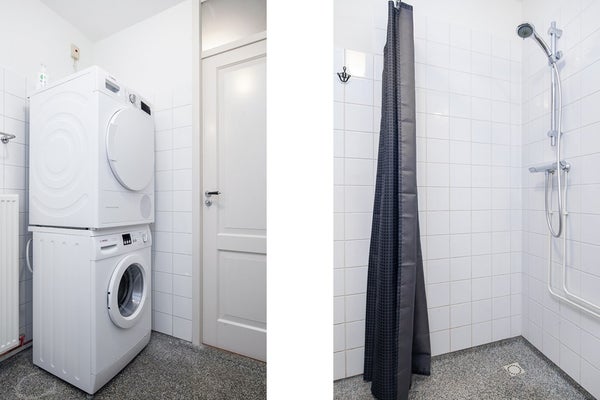 De badkamer heeft een inloopdouche, vernieuwde wastafel en een wasmachine en droger.