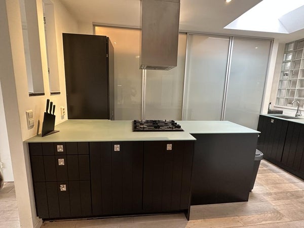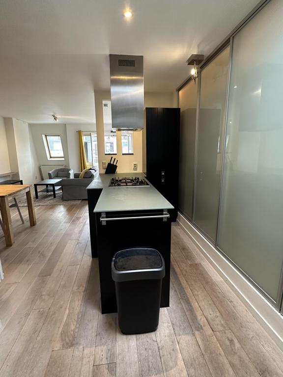 In het midden van het appartement vind je de moderne open keuken, voorzien van een lichtkoepel en een kookeiland. De keuken is volledig uitgerust met inbouwapparatuur, waaronder een koelkast, een gasfornuis met vier branders, een vaatwasser, een moderne afzuigkap en voldoende opbergruimte.
