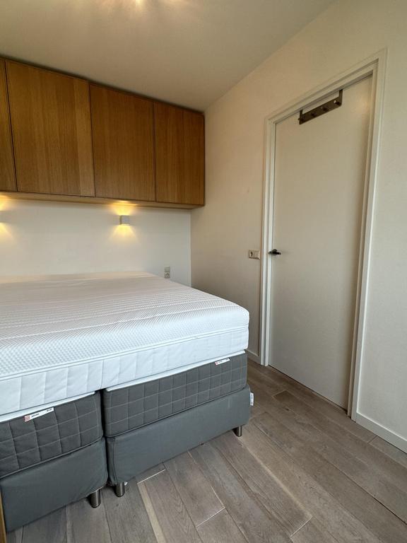 De ruime slaapkamer bevindt zich naast de badkamer aan de rustige achterkant van het appartement en kijkt uit op de groene binnenhoven. Deze kamer maakt optimaal gebruik van ruimte met praktische inbouwkasten.