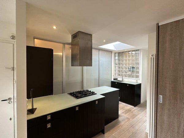 De lichte en ruime woonkamer met open keuken profiteert van overvloedig natuurlijk licht dankzij grote ramen en een lichtkoepel. Het privé dakterras biedt een prachtig uitzicht over de stad. De omliggende buurt wordt gekarakteriseerd door statige gebouwen met mooie, authentieke gevels.