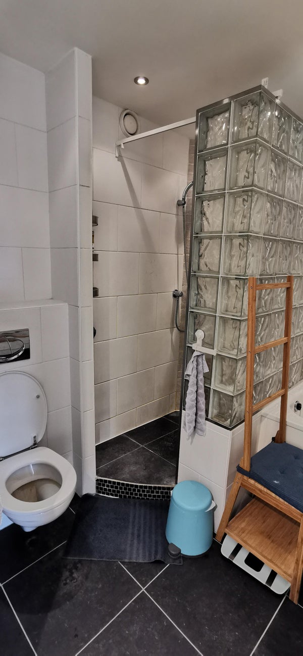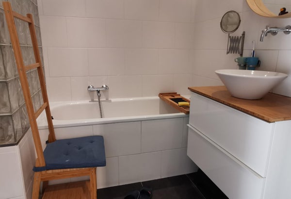 - Badkamer met bad, inloopdouche, wastafel en toilet