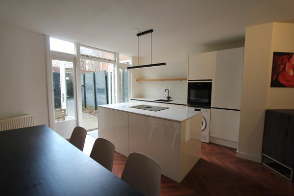 Privé-ingang, hal met bergruimte en Miele droger, ruime master bedroom met tweepersoonsbed en grote kast, 2e slaapkamer/thuiswerkplek met toegang tot de tuin. Luxe, recent gerenoveerde badkamer 2022 met ruime inloopdouche, wastafel, wandcloset, handdoekenradiator en prachtige tegels tot aan het plafond. De nis boven het toilet en de inbouwspots zorgen voor een luxe uitstraling. De ruime en lichte woonkamer met luxe open keuken loopt van de voorkant naar de achterkant van het huis. De grote ramen en openslaande deuren naar de enorme zonnige tuin bieden veel natuurlijk licht. De moderne keuken heeft een groot kookeiland en is uitgerust met luxe inbouwapparatuur, waaronder: Bora inductiekookplaat met afzuiging in het werkblad, koel-vriescombinatie, vaatwasser, combi oven en Miele wasmachine.