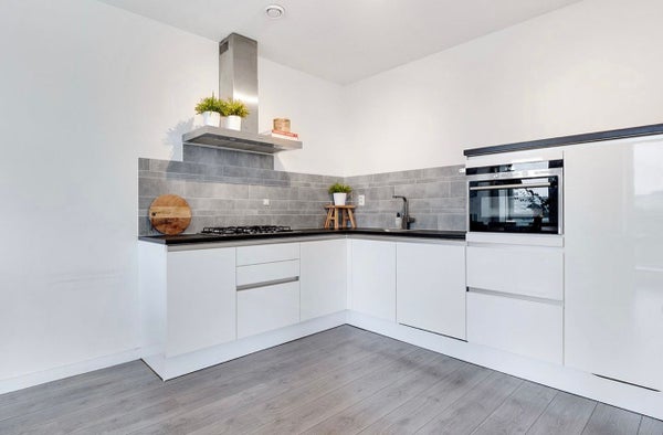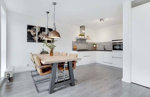 De moderne open keuken is voorzien van inbouwapparatuur en beschikt over alle gemakken die u mag verwachten. De strakke afwerking en praktische indeling maken het een fijne plek om te koken en te leven.