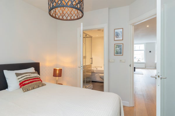 Gemeenschappelijke entree op de begane grond. Via een interne trap bereik je de voordeur op de eerste verdieping die toegang geeft tot de woonkamer. Het appartement kenmerkt zich door de lichte uitstraling met fraaie houten vloer, hoge plafonds en aan de voorzijde een drietal raampartijen uitkijkend op de Wagenaarstraat. De open keuken is uitgerust met de nodige apparatuur. Aan de rustige achterzijde van het appartement twee slaapkamers, waarvan de hoofdslaapkamer met een badkamer en-suite met een ligbad, aparte douche, wastafelmeubel en wc. Tevens aan de achterzijde een tweede slaapkamer met toegang tot ruime gasten wc met aansluiting wasmachine en droger en ingebouwde kastruimte. De buitenruimte: Fijn langwerpig balkon over de gehele achterzijde van het appartement. Ideaal voor een heerlijke cappuccino in de ochtendzon of gezellige borrel in de middag.